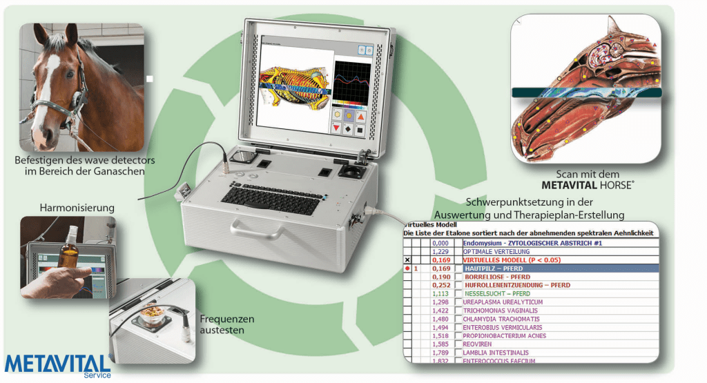 Ich biete eine biophotonenbasierte Ganzkörpermessung vom Organ bis zu den inneren Zellstrukturen an. Der Körperscan erfolgt mit dem Metavital – Horse – System durch spezielle Sensoren, die an den Tierkörper angelegt werden. Die Untersuchung ist völlig schmerzfrei für das Tier. Alternativ kann das Energiefeld auch über Haare oder andere Körpersubstanzen des Tieres ausgemessen werden.